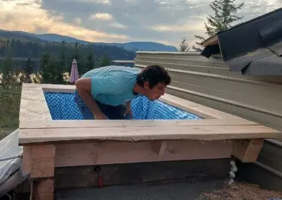– Walipini greenhouse: The main timber frame is up. We have roofing, windows and walls to build.